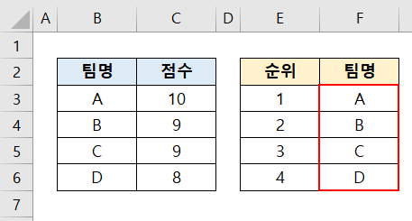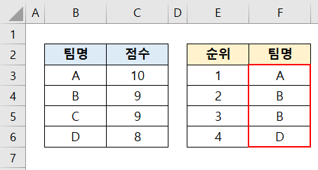 하지만 점수에 중복값이 있기 때문에, 아래와 같이 2, 3위에 B팀이 두 번 들어가게 됩니다.
