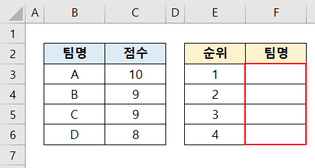 2등에 B팀, 3등에 C팀이 들어가도록 수식을 짜보고자 합니다.