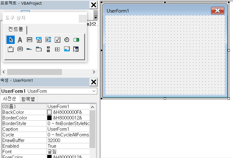 유저 폼을 열면 '도구 상자' 창도 같이 열립니다.